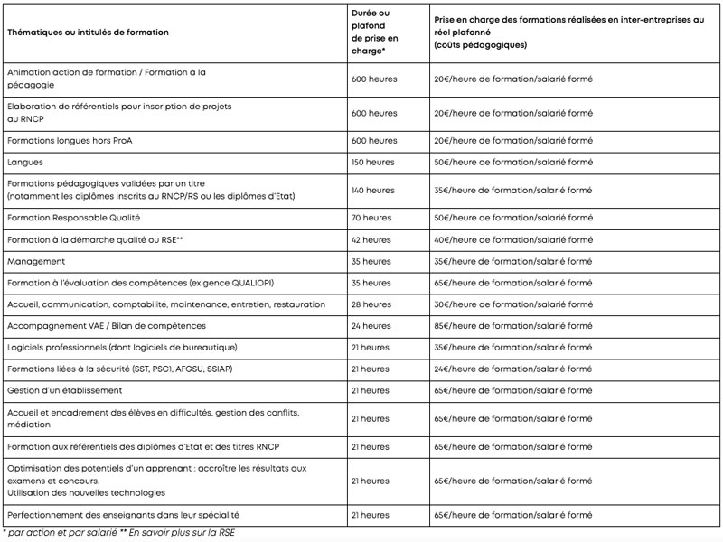 - Durée : dans la limite de 21 heures maximum par salarié formé et d’un plafond de 1 000€/jour