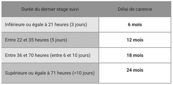 Ce délai à respecter entre 2 formations varie selon la durée de la dernière formation suivie.